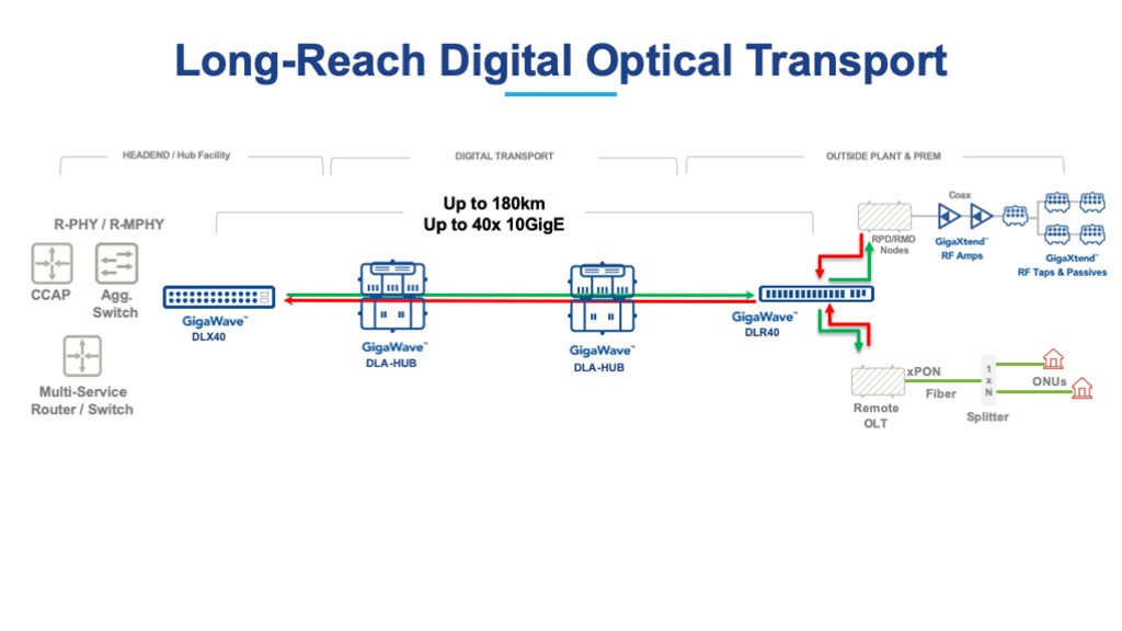 The long-distance digital optical transport solution also includes the GigaWave Digital Link Amplifier-HUB (DLA-HUB), a next-generation EDFA that enables cable operators to extend optical networks 160km or further from headends or hub sites. Equipped with a mid-stage Dispersion Compensation Module (DCM), the DLA-HUB offers several performance and cost-saving advantages over amplifiers using pre- or post-stage DCMs, including a potential reduction in the number of EDFAs and repeat stations required in long-distance deployments. The DLA-HUB enables cable operators to extend multi-Gbps services deep into remote regions, where they can be used in conjunction with Remote-OLT PON equipment to deliver FTTH services to businesses and residents, as well as provide additional services, such as wireless backhaul.