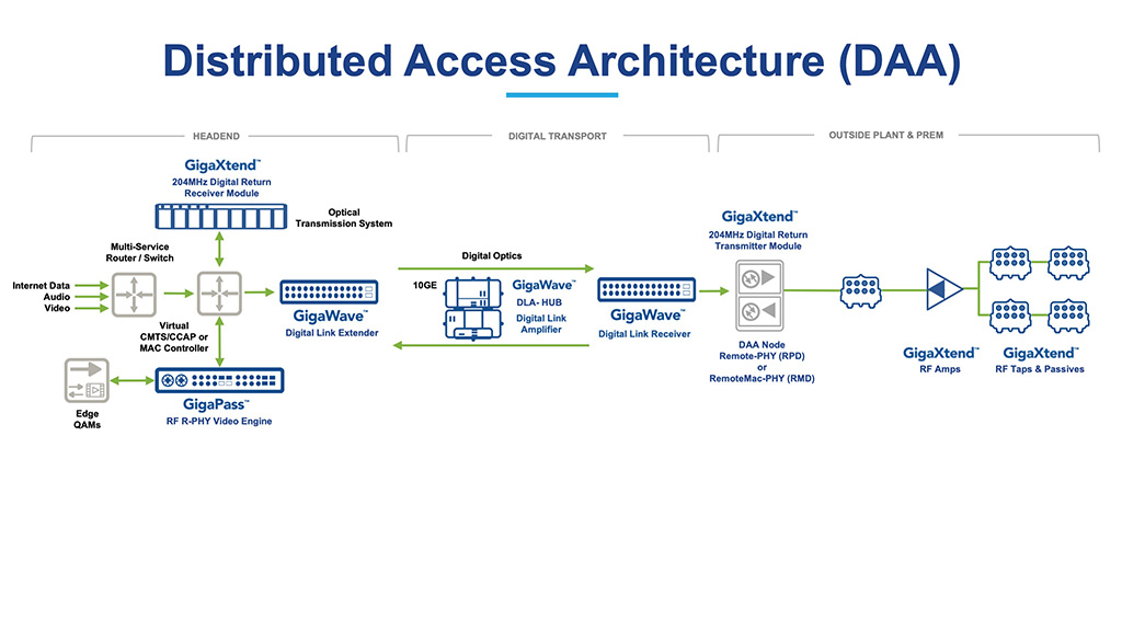 The GigaWave™ digital optical transport solution includes the GigaWave Digital Link Extender (DLX) and Digital Link Receiver (DLR), a highly integrated multiwavelength optical gateway platform, and the Digital Link Amplifier Hub (DLA-HUB), a next-gen, field-hardened optical amplifier. This highly efficient and integrated solution allows MSOs to expand the capacity of access links, migrate to a Remote-PHY/MACPHY architecture, push RF generation deep into the network and replace expensive hubs.